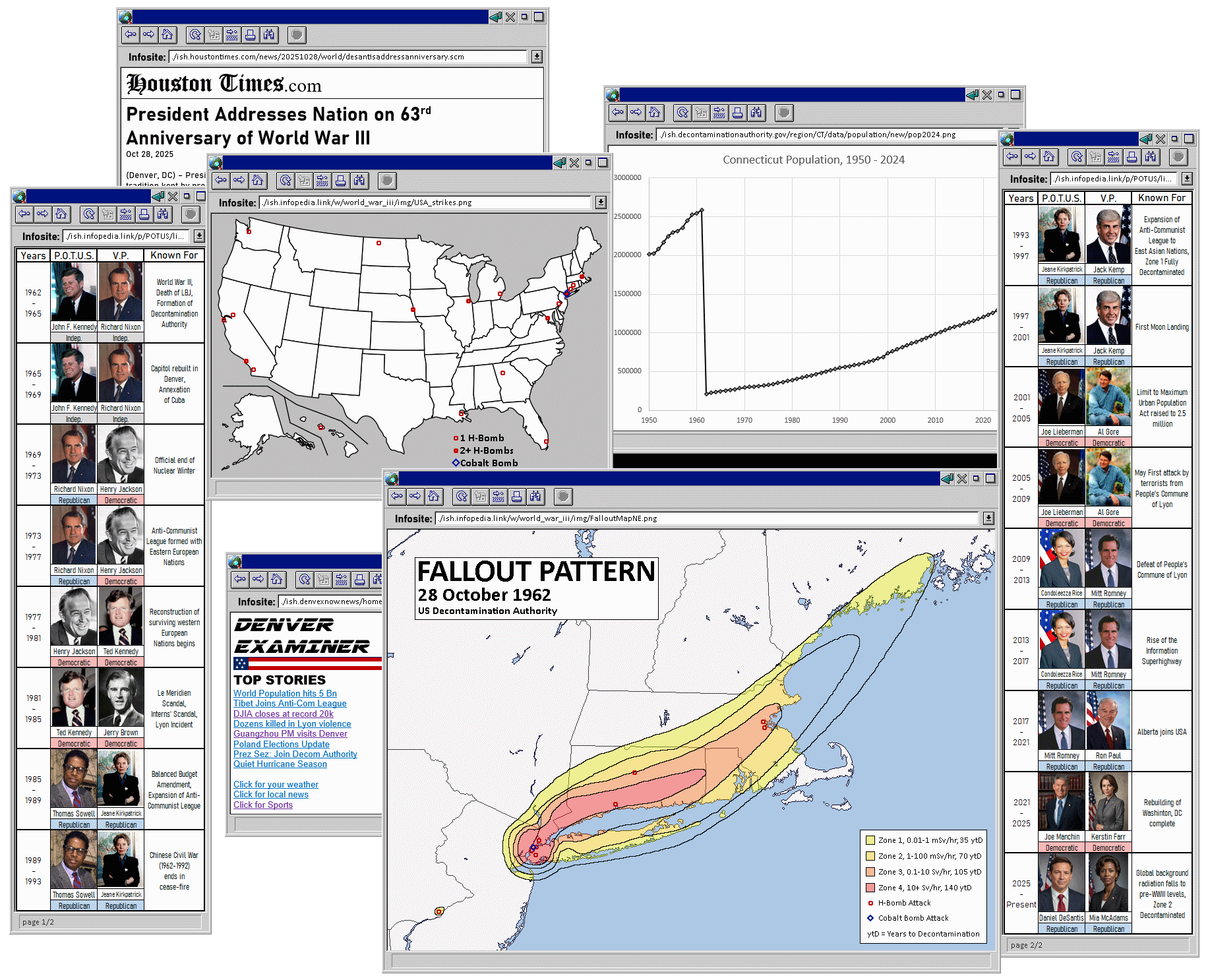 Lo screenshot sopra riportato dimostra che, a causa del ritardo tecnologico provocato dalla Terza Guerra Mondiale, nel 2025 internet, o per meglio dire la Superautostrada delle Informazioni, ha ancora un aspetto che per noi potrebbe sembrare un po' "retrò"... Comunque sia, stai attento, amico! Non credi di aver aperto un po' troppe finestre? Non vorrei che poi ti si surriscaldasse il Commodore...