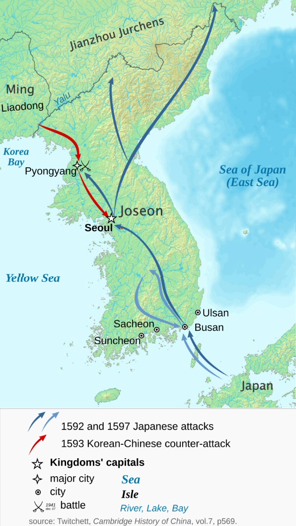 Anche un’espansione verso la Corea é da escludere. Le spedizioni della fine del XVI secolo ordinate da Toyotomi Hideyoshi sono state un po' l'« Adua » dei Giapponesi, una vera sconfitta traumatizzante: oltre alla sconfitta della flotta, i samurai si sono ritrovati intrappolati in Corea morendo di fame. Il sogno megalomane di Hideyoshi é stato poi condannato da tutti, e ogni idea di conquista continentale ritenuta utopica. Il Giappone considererà ancora la Cina come la superpotenza assoluta fino alla metà del XIX secolo, quando vedrà i progressi dei Nanban, i barbari del Sud, cioè gli Europei.