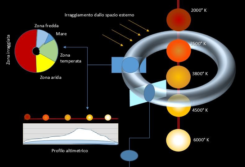 Non essendoci movimenti di rotazione, il mondo ciambella è privo di campo elettromagnetico, e pertanto non ha protezione dall'irraggiamento proveniente dallo spazio esterno. La faccia esterna, esposta a questo bombardamento, è inabitabile e desertica. La faccia interna è riscaldata dal reattore termonucleare, il cui ciclo termico, illustrato nella grafica, parte da una temperatura superficiale di circa 6000°K e si raffredda progressivamente durante la salita lungo l'asse solare, fino a raggiungere una temperatura inferiore a 2000°K all'apice dell'asse, dopo 2,2 giorni terrestri. Successivamente il «sole» artificiale si spegne e il ciclo riprende dalla parte opposta del toro.