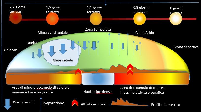 Nella parte centrale della sezione toroidale, la pressione degli strati esterni induce la liquefazione delle rocce e produce dando origine al fenomeno della tettonica a zolle: la differenza di temperatura fra le due facce opposto del toro condizionano lo sviluppo orografico e l'intensità dei fenomeni vulcanici, dando origine ad un profilo altimetrico sbilanciato, per cui il settore centrale inferiore è montagnoso e il settore centrale superiore è pianeggiante ed ospita il mare radiale.
