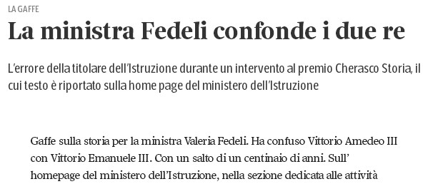 In questo articolo si parla della clamorosa gaffe in cui è incappata il 6 giugno 2017 il Ministro della Pubblica Istruzione Valeria Fedeli, che sull'home page del sito del suo Ministero, nella sezione dedicata alle attività della ministra, ha pubblicato il suo intervento per il premio Cherasco Storia. In esso si legge: « È qui che nel 1631 venne firmata la Pace che concluse la guerra del Monferrato, durante la peste che fa da sfondo ai Promessi Sposi. È qui che più tardi, nel 1796, Napoleone impose a Vittorio Emanuele III l'armistizio con cui decretò la capitolazione Sabauda ». Il testo è stato poi corretto, ma lo strafalcione ha fatto rumore. Ovviamente il sovrano che trattò con il Bonaparte era Vittorio Amedeo III, che fu re di Sardegna e duca di Savoia, Piemonte e Aosta dal 1773 al 1796. Tuttavia l'ucronia nasce spontanea: quali PoD bisogna immaginare perchè Vittorio Amedeo III, come il suo parente Vittorio Emanuele III un secolo e mezzo dopo, sia già Re d'Italia nella seconda metà del Settecento?