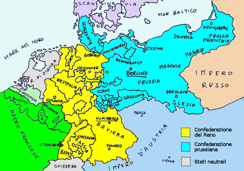 La Prussia però non si rassegna e, sfruttando il sentimento antifrancese di buona parte degli stati tedeschi protestanti, riesce a ricostituire nel 1872 una Confederazione con Sassonia, Meclemburgo ed altri stati minori, presieduta dal re Guglielmo I. In tal modo la riunificazione tedesca non si completa e si formano due stati anche ideologicamente contrapposti: la Prussia luterana e antifrancese e la Renania, filofrancese e dominata dalla cattolica Baviera. L'Italia invece che alla Germania guarda da subito verso Parigi. Deve però rinunciare a Roma capitale, in quanto lo Stato Pontificio di Pio IX è un protettorato militare francese. In cambio Napoleone III sostiene Amedeo di Savoia sul trono spagnolo.