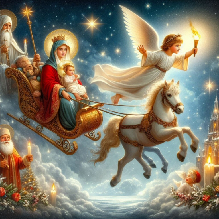 Gesù Bambino ogni 24 dicembre sale sulla sua slitta d'argento e si prepara a volare sopra la Terra. Ha 3 anni, 3 mesi e 3 giorni, ma come dice il Corano ha il discernimento di un adulto. La Slitta porta una lanterna dentro cui brilla l'astro che indicò ai Magi la via verso Betlemme, ed è tirata da quattro esseri viventi, coperti d'occhi davanti e dietro: il primo ha l'aspetto di un uomo, il secondo di un leone, il terzo di un torello, il quarto di un'aquila. Essi rappresentano i quattro elementi, ed anche i quattro regni della Natura (dei minerali, dei vegetali, degli animali, degli unicellulari) su cui Gesù ha il completo dominio. I finimenti dei quattro esseri viventi sono d'oro, come pure le briglie che Egli tiene in mano. Egli regge anche una torcia, simbolo della Luce della Fede che squarcia le tenebre del mondo. È fatta con un ramo del roveto ardente di Mosè, e brucia in eterno senza mai consumarsi.
