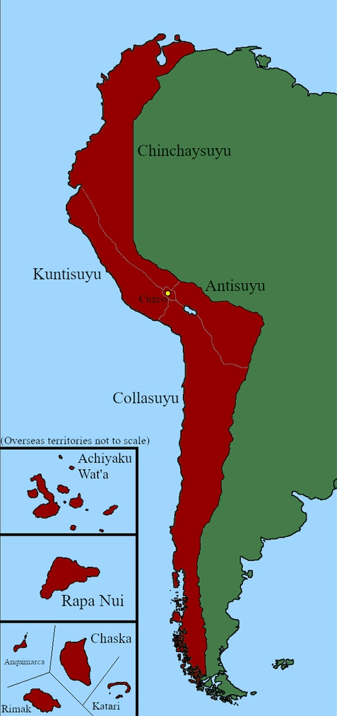 I Sapa Inka Huayna Capac, intanto, proseguendo le sue campagne verso sud, incontra il forte e bellicoso popolo dei Mapuche, e li sconfigge ripetutamente; introducendo una innovazione dei recentemente sottomessi Chimù del nord, diffonde nel suo impero la moneta metallica, garantita dal tempio delle vergini di Cuzco. Alla sua morte, nel 1536, tutto il territorio Mapuche fa parte dell'impero Quechua, così come il paese dei Chachapoya ad est; le esplorazioni lungo il corso dell'Ucuyali e del Guaporé portano al contatto con numerosi popoli agricoli, assai diversi tra loro ma sostanzialmente affini ai chachapoya benchè più arretrati. Lungo il Guaporé si incontrano alcune cittadelle, con cui sono stabiliti rapporti commerciali. Negli ultimi anni del suo regno, ci sono scontri con l'alleanza chibcha del nord, guidata da Bogotà.