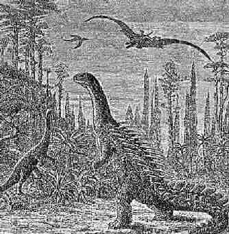 Francobollo inglese sul tema dei dinosauriPrima di concludere, però, io ci tengo a far notare come, contrariamente a quanto si crede di solito, i dinosauri NON si sono affatto estinti tutti insieme, in un colpo solo! Questa è un'altra clamorosa "bugia dinosauresca", e le prove contro di essa sono eloquenti. Finora ci sono note 550 specie totali di dinosauri, compresi quelli di cui sono conosciute solo le orme o pochissimi frammenti di ossa, su un presunto totale di 6000-7000 specie che devono essere comparse e scomparse durante i 180 milioni di anni dell'era Secondaria (14 giorni dell'Anno della Terra). Queste specie sono riunite in 400 generi. Comprendendo anche i rettili attuali, che però sono radicalmente diversi dai dinosauri, si perviene ad un totale di 44 ordini. Di essi la metà, e cioè ben 22 ordini, erano già estinti 130 milioni di anni or sono, cioè alla fine del Giurassico, nel corso del quale l'espansione dei rettili terribili aveva raggiunto il suo culmine. Tra le famiglie di dinosauri che non sopravvissero al Giurassico, bisogna ricordare la maggior parte dei Sauropodi, cioè i dinosauri dal corpo enorme e dal lungo collo, sempre rappresentati come i dinosauri per antonomasia da tutta l'iconografia scientifica e non.