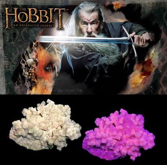 Sopra: Gandalf impugna la sua spada magica Glamdring. Sotto: un campione di Aragonite proveniente da una miniera siciliana, fotografata sotto luce naturale (a sinistra) e sotto esposizione di raggi ultravioletti (a destra), da questo sito |
