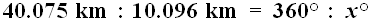 Cominciamo con il confrontare la Cintura di Arda Piatta con l'equatore terrestre. La prima, se ricordate, misurava (secondo le mie stime) 6.275 miglia, cioè circa 10.096 km, mentre il secondo è stimato in 21.638,8 miglia nautiche, pari a circa 40.075 km. Se quest'ultimo corrisponde a 360° di longitudine, l'ampiezza in longitudine sulla superficie terrestre si individua con una semplice proporzione: