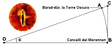 La Torre Oscura (posta in A) risulta visibile dal Morannon (che si trova in B) se la tangente alla circonferenza terrestre nel punto B lambisce in C la sommità della paurosa dimora di Sauron, considerando che la luce si propaga in linea retta. L'arco AB misura come detto 160 km; considerando una circonferenza terrestre di 40.000 km, per trovare quanto vale il corrispondente angolo al centro AÔB = α basta una proporzione: