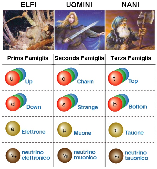 Questo continuo ritornare del numero TRE nella Fisica delle Particelle ci ricorda che TRE sono anche i popoli di Arda: Elfi, Uomini e Nani! Ecco dunque uno schema riassuntivo delle tre famiglie di corpuscoli, dove ad ogni quark sono associati tre possibili "colori" (una proprietà che nulla ha che vedere con la visione umana):