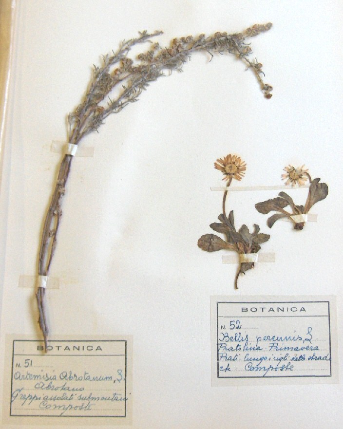 Con l'abrotano (Artemisia abrotanum) entriamo nelle Composite. Invadente nei luoghi rupestri e sulle morene glaciali, è un'erba che emette un odore talvolta sgradevole, con pannocchie ampie e foglie biancastre sulla pagina inferiore; in montagna viene utilizzato con altre erbe per produrre liquori (il "genepì"). Qui vediamo anche una pratolina o margheritina (Bellis perennis), il fiore universalmente più diffuso nei prati, che rappresenta tipicamente il preannuncio dell'arrivo della primavera. |