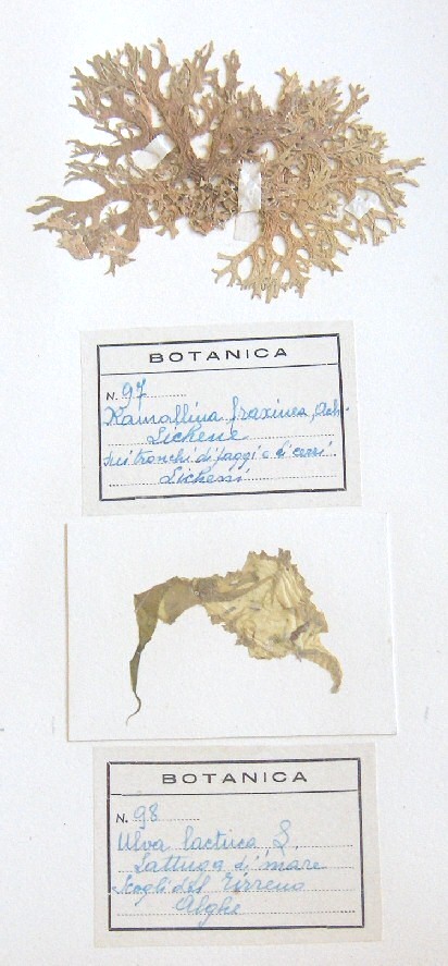 La penultima pagina dell'Erbario ci mostra un lichene (precisamente Ramallina fraxinea) ed un'alga: in questo caso Ulva lactuca, la lattuga di mare, così detta per la sua somiglianza con una foglia di lattuga terrestre. |