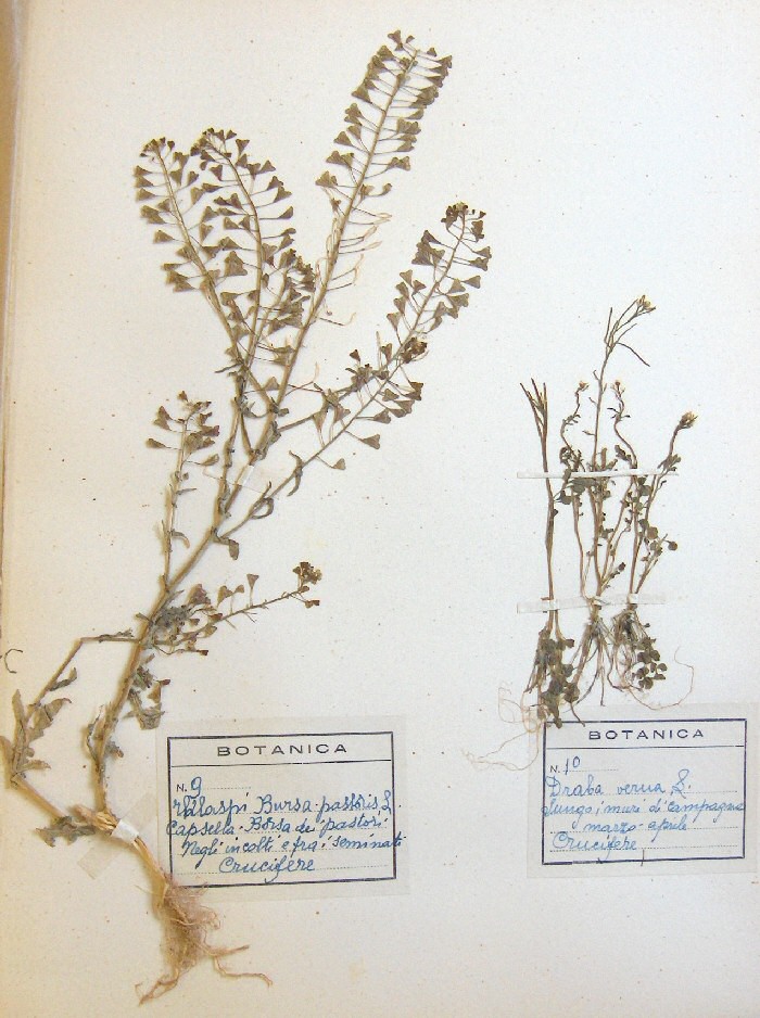 Un'altra Crucifera: la borsa dei pastori (Capsella bursa pastoris), erba annua alta dai 20 ai 40 cm, con foglie picciolate di varia forma a margine seghettato, fiori piccoli cruciformi e piccoli frutti che ricordano nella forma, per l'appunto, la borsa di un pastore, da cui il nome. Comunissima nei luoghi coltivati, fiorisce da marzo a dicembre praticamente in tutt'Italia. In questa pagina si vede anche la Draba verna, un'erba annua alta fino a 15 cm, tipica dei luoghi sassosi dell'Europa centromeridionale. |