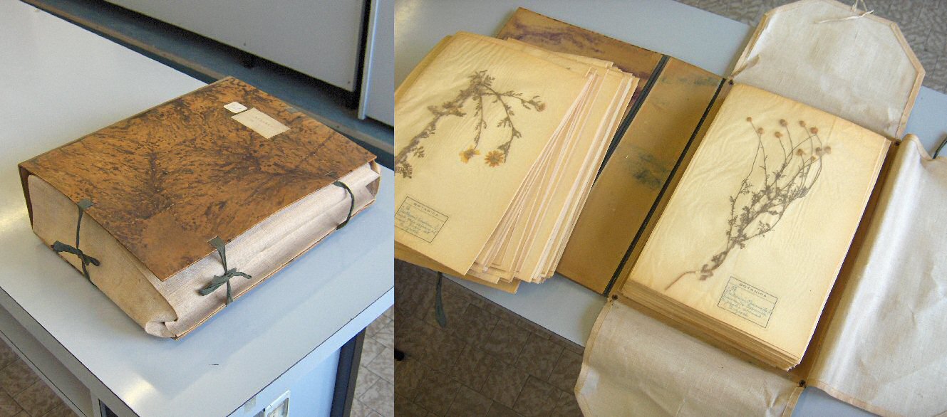 Comincia con questa immagine l'ultima sezione di questo Armadio Virtuale, dedicata all'erbario. Si tratta di un antico metodo per raccogliere erbe, foglie e fiori: li si pone tra due fogli di carta assorbente e si mette il tutto sotto pressione. La carta assorbe tutta l'umidità dei campioni, che così seccano e si conservano, talvolta anche con il loro colore originale. Qui vediamo un erbario di ottima fattura, risalente agli anni cinquanta e contenente 100 pagine, di cui ora ne vedremo alcune nel dettaglio. |