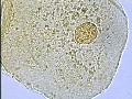 Ed ecco un altro esempio di osservazione al microscopio didattico: quella qui fotografata con la stessa tecnica delle precedenti è una cellula della mucosa boccale umana, prelevata in modo molto semplice da uno studente tramite un tampone. Mentre la fotografia precedente è scattata a 400 ingrandimenti, in questo caso si è giunti fino a 1000 ingrandimenti. In essa sono così ben visibili gli organuli, suddivisi in compartimenti e circondati da citoplasma, separati da esso attraverso la membrana plasmatica. |
