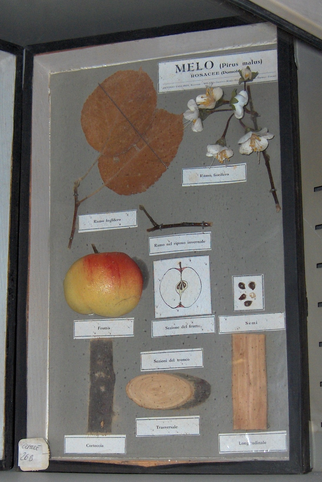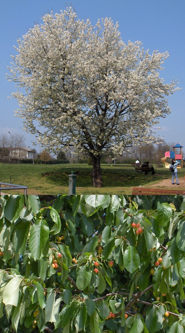 Del melo (Pyrus malus o Malus communis) abbiamo già parlato sopra. Sullo stesso foglio dell'Erbario Virtuale si trova anche un rametto di ciliegio selvatico o ciliegio degli uccelli (Prunus avium), diffuso nei boschi europei. Albero più alto del melo (raggiunge i 20 m), fornisce ciliege note come "duracine", "tenerine" e "visciolone". Per la bellezza dei suoi fiori primaverili è coltivato anche come albero ornamentale. |