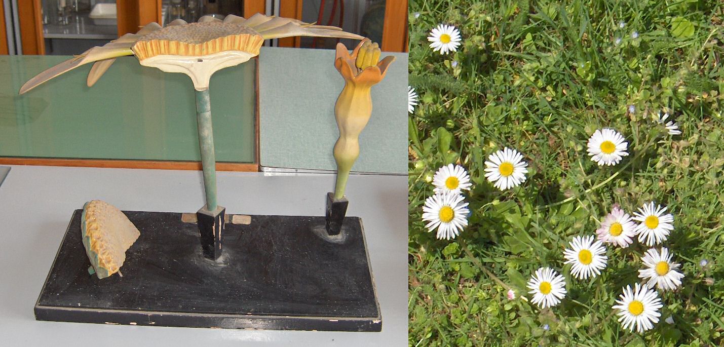 Si dice infiorescenza ciascuna delle modalità con cui i fiori si raggruppano tra di loro nelle Angiosperme; quella rappresentata nel modello in figura (un po' datato e danneggiato) prende il nome di infiorescenza ad ombrello semplice, un'infiorescenza di tipo "centripeto" o "acropeto" perchè i fiori più lontani dal centro dell'infiorescenza sono i primi a fiorire; "centrifughe" o "acrofughe" sono invece quelle che cominciano a fiorire dal centro. Altra distinzione riguarda invece l'asse, a seconda che esso si ramifichi indefinitamente oppure termini con un fiore recandone altri senza l'intervento di ramificazioni. |