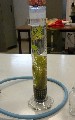 Per ottenere questo scopo si possono usare enzimi proteolitici, oppure semplice succo di ananas, il quale contiene la bromelina, una sostanza capace di demolire le proteine negli amminoacidi, Il DNA è molto solubile in acqua, dove diviene invisibile, mentre è invece insolubile in alcool, nel quale precipita e si rende visibile. Conviene dunque versare lentamente nella provetta dell'alcool raffreddato; il DNA diventa visibile ed appare come un precipitato lattiginoso, così come mostra questa foto che presenta esattamente l'estrazione deil DNA da un kiwi. A questo punto si può procedere all'osservazione al microscopio, ed è di questo che ora parleremo. |