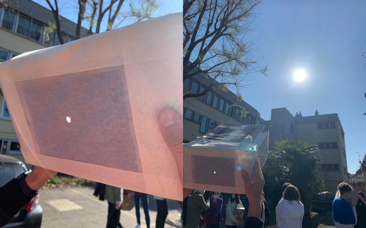 Un'interessante applicazione della camera oscura è l'elioscopio, che vedete raffigurato in questi scatti del mio studente Davide Ferrari (2 C a.s. 2021/22). Il 24 marzo 2022 ho fatto costruire ai miei studenti di seconda delle camere oscure con materiale povero (scatole di cartone, carta oleata, nastro adesivo), quindi li ho portati nel parcheggio del Liceo, e siccome la mattinata era calda e assolata, ho detto loro di puntare il foro stenopeico verso il Sole, facendo attenzione a non guardarlo mai direttamente. Come si vede, sulla carta oleata si proietta l'immagine del disco solare; misurandone il diametro con un calibro ventesimale e facendo ricorso ad una semplice proporzione, è immediato stimare con una certa precisione la misura del diametro del Sole. Enjoy it! |