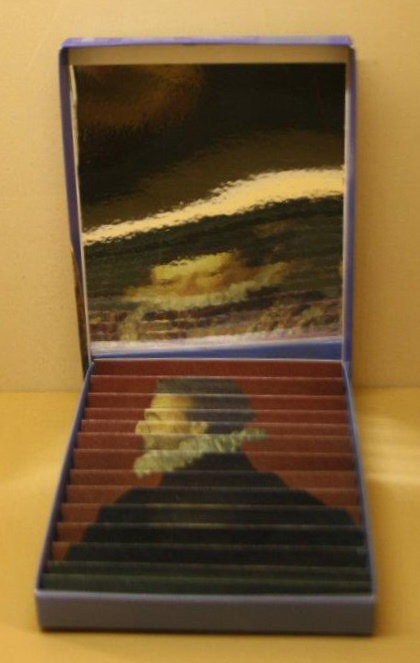 La fotografia riprende la scatola di legno che contiene un'ampia collezione di reticoli, tra cui quello ritratto nella fotografia precedente, nonché un' utile guida metallica su cui sistemarli mediante un supporto a forma di cuneo. Utilizzando il laser sopra descritto è facile osservare attraverso di esso l'interferenza e la diffrazione delle onde luminose. |