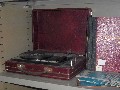 Un pezzo che non può mancare in questo Laboratorio Virtuale è il fonografo, l'antenato dei nostri lettori CD. Inventato da Thomas Alva Edison nel 1877, consiste in una puntina che legge un disco di vinile (alcuni sono visibili sulla destra), il cui solco trasmette alla puntina un moto ondulatorio poi trasformato in onde sonore da un dispositivo elettromagnetico. I dischi di vinile a 33 e a 45 giri sono tuttora ricercatissimi dai collezionisti. |