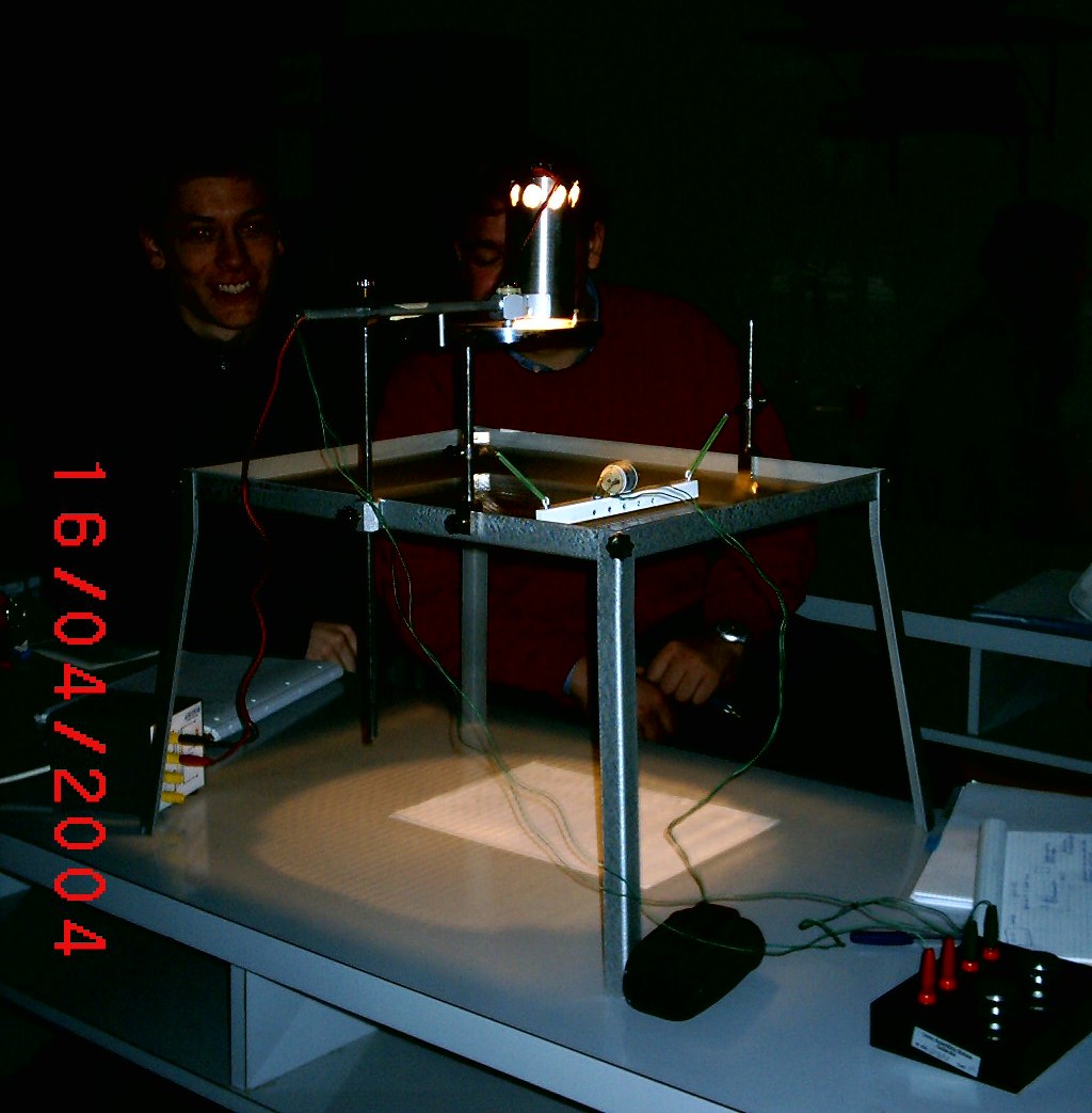 Anche questa fotografia la si deve a Marta Milano, e rappresenta un altro geniale dispositivo per verificare il fenomeno dell'interferenza delle onde luminose con il metodo di Young: la luce di un laser viene scomposta in due sulla destra, poi un fotodiodo (estrema sinistra) misura l'intensità della luce e la tabula direttamente su Pc. Come si vede si ottengono i massimi e minimi tipici di una figura d'interferenza, dimostrando così inequivocabilmente che la luce è un'onda. |