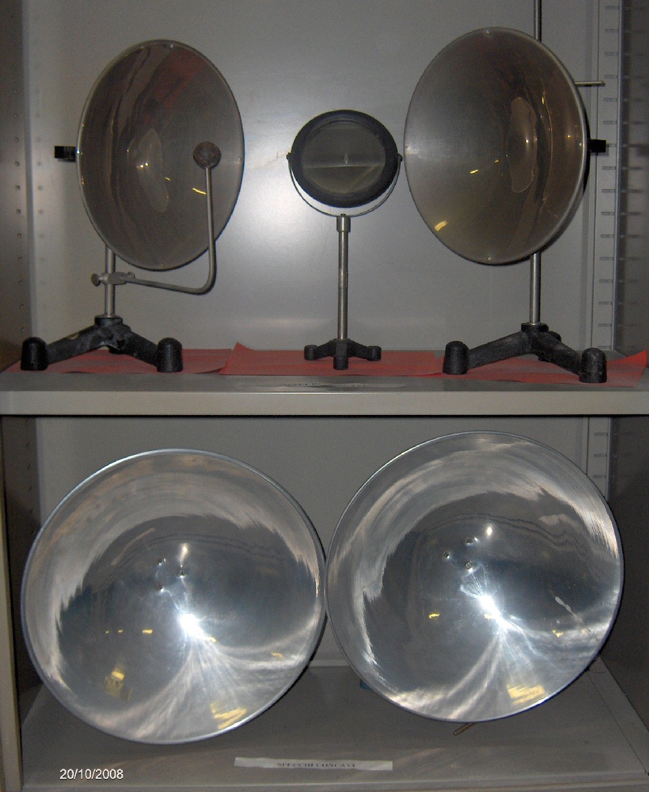 In questa foto vedete ritratti due ripiani del nostro Armadio Virtuale, sui quali sono posti in bella vista alcuni specchi sferici per esperienze di ottica. Con essi è possibile verificare la costruzione dell'immagine generata da uno specchio sferico di piccola curvatura seconda le leggi dell'ottica geometrica, un argomento purtroppo trascurato nelle odierne lezioni di Fisica, e che invece io giudico didatticamente molto utile per mostrare la strettissima interconnessione tra Geometria teorica e Fisica osservativa. |