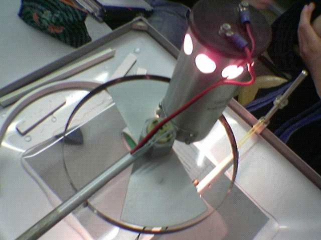 Questa fotografia, ripresa invece da Roberto Carettoni (II B cl. a.s. 2004/05), illustra un ulteriore dettaglio preso dall'alto dello stroboscopio. Come si può vedere, la ventola interrompe il fascio di luce permettendo la facile visualizzazione delle onde in questione. Il principio è lo stesso delle luci psichedeliche di una discoteca. |