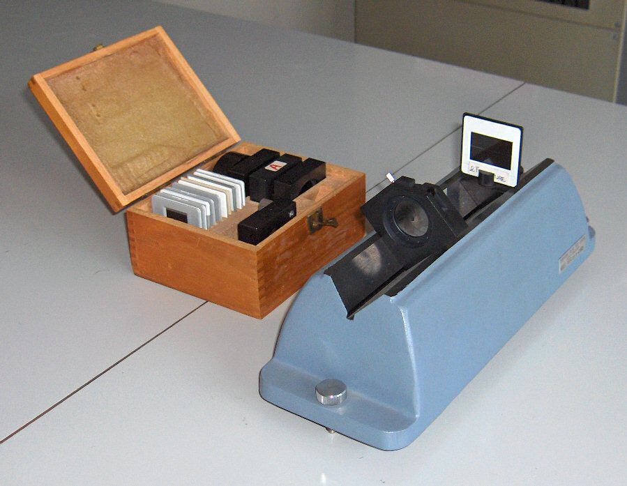Non c'è nulla meglio di questo stereovisore anni '70 per illustrare il fenomeno della visione binoculare: di due immagini uguali il cervello ne fa una sola. Funziona come i proiettori sottostanti, ma non ha lampadine e basta puntarlo verso una fonte di luce. |