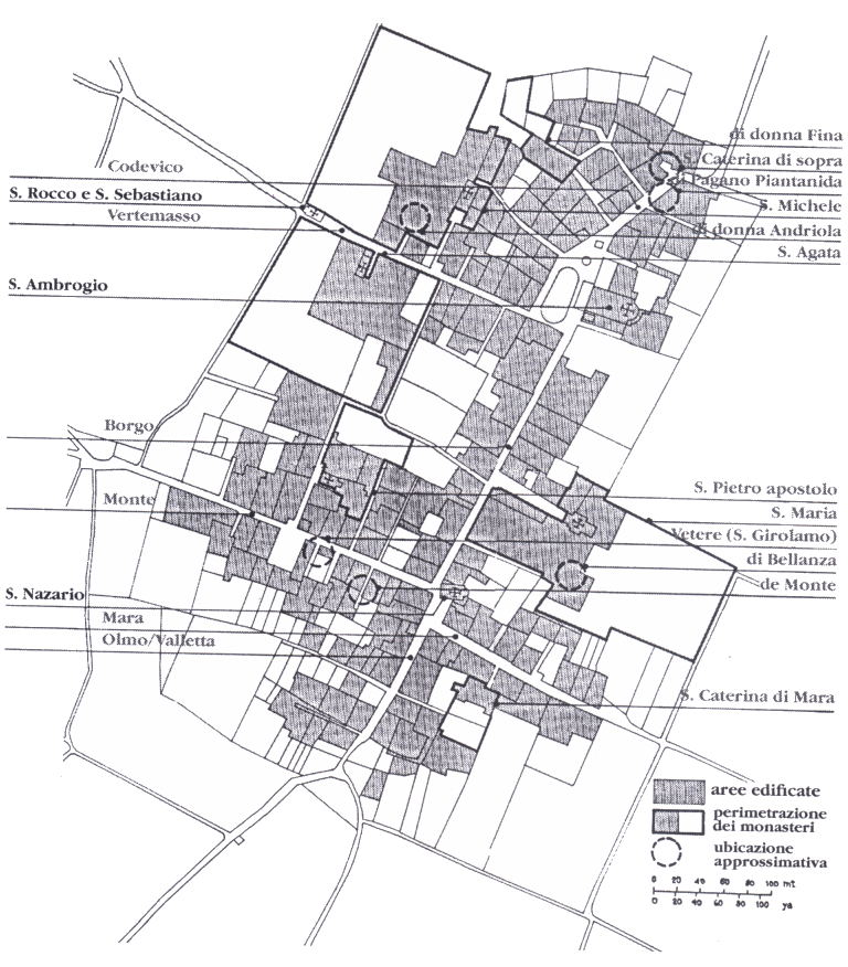 Lonate nel Medioevo era famosa anche per i suoi numerosi conventi, dei quali è possibile vedere qui sotto una cartina dettagliata disegnata da A.Spada; in essa si vedono sia le chiese che le domus monastiche, e vi è anche indicazione delle contrade dell'antico borgo di Lonate: