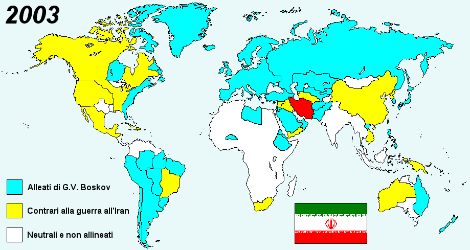 2003 d.C., 1 gennaio: proclamazione ufficiale della nuova Repubblica di Palestina con capitale Abu Dis, villaggio che viene inglobato nella "Grande Gerusalemme" in modo da poter affermare che Gerusalemme, oltre che dello Stato d'Israele, è capitale anche della Palestina. Neutralizzazione della Città Vecchia di Gerusalemme, presidiata da poliziotti di entrambi gli stati, e libero accesso di tutti i credenti ai Luoghi Santi. Proteste feroci dell'estrema destra israeliana e degli estremisti palestinesi che volevano la Terrasanta tutta per loro. 9 gennaio: Hans Blix, il capo degli ispettori ONU in visita in Iran, dichiara di non aver trovato alcuna prova che il regime di Teheran possieda armi di distruzione di massa. 24 gennaio: si chiudono a Porto Alegre, nel Nuovo Brasile (Australia Occidentale), i lavori del Forum sociale mondiale, dove rappresentanti di tutto il mondo rigettano il principio della "guerra preventiva" annunciato da Boskov. 28 gennaio: nel suo consueto Discorso sullo Stato dell'Unione, Georgij V. Boskov sostiene che i servizi segreti normanni hanno ricevuto da quelli francesi alcuni documenti, che proverebbero il tentato acquisto da parte del dittatore iraniano Saddam Hussein di uranio impoverito dal governo bianco di Bet-Baal (il nostro Burkina Faso; nella nostra Timeline dal Niger), ed intende utilizzarlo per costruire una bomba atomica. Secondo il presidente europeo, tutto ciò è una prova sufficiente per giustificare l'invasione dell'Iran (più tardi questi documenti si riveleranno un falso abilmente confezionato). 29 gennaio: il governo italiano di centrosinistra si chiama fuori da qualunque avventura militare in Iran e, pur restando nell'ambito della struttura militare della NATO, rifiuta l'utilizzo delle basi sul territorio italiano agli aerei europei da utilizzare nell'attacco all'Iran. Dure proteste di Fini, leader di AN e capo dell'opposizione. 1 febbraio: una nuova sciagura colpisce gli Stati Uniti d'Europa: lo Space Shuttle esplode nella fase di rientro e muoiono tutti e sette gli astronauti a bordo, tra cui il primo cosmonauta israeliano della storia. Per una tragica fatalità i suoi nonni erano morti in un campo di concentramento nazista. 10 febbraio: il cardinale francese Roger Etchegaray è inviato dal Papa a Teheran per convincere Saddam Hussein a lasciare spontaneamente il potere; il dittatore lo riceve ma non se ne dà per inteso. Il cardinale Pio Laghi, già nunzio negli USE ed amico personale della famiglia Boskov, è invece spedito a Washington (Parigi), ma anche lui fa un buco nell'acqua. 11 febbraio: nella Cina Nazionalista si diffonde l'epidemia di SARS (Sindrome respiratoria acuta grave). 14 febbraio: muore per un'infezione polmonare la pecora Dolly, il primo mammifero clonato. 15 febbraio: si tengono manifestazioni per la pace in diverse capitali europee. Anche Francia e Germania si chiamano fuori dalla guerra, mentre RUA, Polonia, Croazia, Spagna, Portogallo e Russia Euroasiatica offrono il loro appoggio logistico e militare. Anche Giappone, Corea del Sud, Nuovo Messico del Sud, Eritrea, Etiopia e gli stati africani cartaginesi si schierano con Boskov. Dura condanna dell'opzione militare da parte del presidente della Russia in Atlantide, Lukashenko, del premier nazionalista cinese Hu Jintao e del presidente francese Jacques Chirac. Boskov bolla con il termine spregiativo di "Vecchia Atlantide" i paesi (Italia, Francia, Germania, Russia) che si sono schierati contro di loro, e negli USE avvengono contromanifestazioni a sostegno della guerra: alcuni fanatici sostenitori di Boskov versano nelle fogne il vino e l'olio italiani, essendo il governo italiano il primo che si è schierato contro la nuova avventura militare. 19 febbraio: ormai la decisione dell'attacco è stata presa, perchè: il governo dei RUA invita i propri cittadini ad abbandonare immediatamente l'Iran. Intanto nel Congo dilaga un'epidemia di Ebola, una febbre emorragica che miete vittime a migliaia. 21 febbraio: un terremoto devasta la regione cinese del Sinkiang, nell'Ovest musulmano del Paese, provocando 257 morti e un migliaio di feriti. 27 febbraio: a Londra viene approvato il progetto dell'architetto Daniel Liberskind, che prevede un "Giardino della Memoria" ed un'ardita guglia alta 541 metri (1776 piedi, che ricordano la Dichiarazione d'Indipendenza degli USE), destinata a sorgere a Ground Zero al posto delle Torri gemelle: sarà l'edificio più alto del pianeta. 2 marzo: la polizia ferroviaria sul treno Roma-Firenze ingaggia una sparatoria con due militanti delle Nuove Brigate Rosse, Mario Galesi e Nadia Desdemona Lioce. Muoiono Galesi ed il soprintendente di polizia Emanuele Petri, mentre la Lioce è catturata e processata. 5 marzo: Italia, Francia, Germania e Russia in Atlantide ribadiscono che non sosterranno una risoluzione ONU che autorizzi il ricorso alla forza contro l'Iran. 6 marzo: il presidente palestinese Yasser Arafat nomina Mahmoud Abbas (nome di battaglia Abu Mazen) primo ministro del nuovo stato. Presentato il libro di profondissime e profetiche poesie di Karol Wojtyla "Trittico Romano". 7 marzo: USE, RUA e Spagna pongono un ultimatum di 10 giorni a Saddam Hussein: o lascia il potere spontaneamente o sarà la guerra. 8 marzo: a Nuova Malta (la nostra Giamaica) si svolge il referendum per l'ingresso nell'Unione Atlantidea, promosso dal governo conservatore di Eddie Fenech-Adami. Il 53,65% dei votanti si dichiara favorevole all'ingresso nell'UA. 12 marzo: a Belgrado il premier serbo Zoran Djindjic viene assassinato. 15 marzo: dopo 57 anni di esilio, i Savoia rientrano in Italia. 15 marzo: la Corte suprema spagnola mette al bando il partito indipendentista galiziano (del nostro Ecuador). 17 marzo: Saddam respinge l'ultimatum di USE, RUA e Spagna. 20 marzo: alle 3.55 del mattino cominciano i bombardamenti su Teheran e sul resto del paese, mentre le forze statunitensi e normanne entrano in Iran dall'Anatolia e dal Golfo Persico: ha inizio la Seconda guerra del Gol