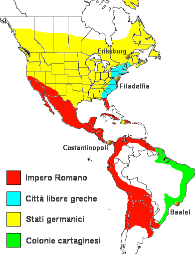 455 d.C.: i Vandali mettono a ferro e fuoco Ostia, capitale dei cartaginesi in Italia, quindi sconfiggono i punici al largo di Cagliari e minacciano la stessa capitale. L'imperatore Hanan-Baal III ordina la ritirata dall'Europa per difendere il nucleo territoriale dell'impero, che d'ora in poi è limitato alle province africane, alla Sicilia, alla Sardegna, alla Corsica, alla Palestina, alla Siria e all'Anatolia. In Gallia si formano i regni dei Franchi e dei Burgundi, in Italia quello degli Ostrogoti (i Visigoti sono passati quasi tutti in Atlantide), in Pannonia quello dei Gepidi, in Spagna quello dei Vandali. La Grecia dà vita ad un regno di stampo ellenistico con capitale Mistra, l'antica Sparta, perchè Atene è stata completamente rasa al suolo dai punici. Gran parte dei punici che hanno dovuto lasciare l'Europa sotto la pressione dei Germani si trasferisce nel Brasile.