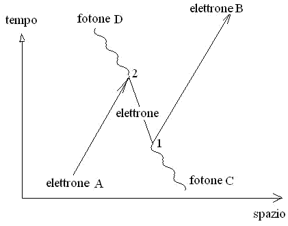Allo stesso modo Feynman descrisse l'interazione tra due elettroni in moto relativo. Ad un certo istante, quando l'elettrone di sinistra si trova in A, emette un fotone virtuale, e di conseguenza cambia direzione e velocità. Questo fotone, rappresentato nel diagramma sottostante dalla linea ondulata, viene successivamente assorbito in B dal secondo elettrone, che a sua volta cambia direzione. Dato che il fotone non viene rilevato, le due particelle sembrano avvicinarsi e poi respingersi per una misteriosa azione a distanza; in realtà tra di esse vi è stata un'interazione attraverso la particella mediatrice, emessa dall'una e assorbita dall'altra, che ha garantito il "contatto" fra le due particelle, e si è propagato a velocità finita. Dobbiamo dunque immaginare ogni particella carica come se fosse circondata da una "nuvola" di fotoni virtuali, emessi e continuamente riassorbiti, che in presenza di altre particelle cariche interagiscono con esse, dando vita all'attrazione o alla repulsione tra cariche. Questo andamento dell'interazione elettromagnetica può essere schematizzato attraverso la rappresentazione sottostante, detta diagramma di Feynman: