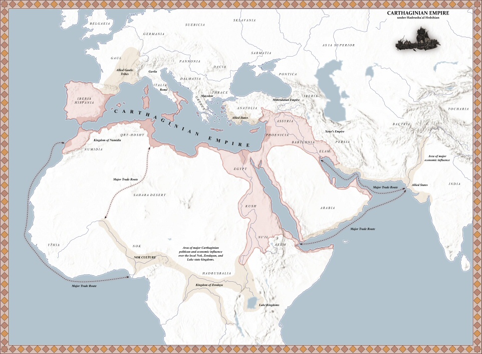 Nei secoli successivi Cartagine espanderà i suoi confini dal Mar Rosso alle Canarie, più la penisola iberica; Latina, invece, conquisterà i territori dai Pirenei al fiume Elba; i greci dominano i balcani dal Mar Adriatico al Mar Nero.