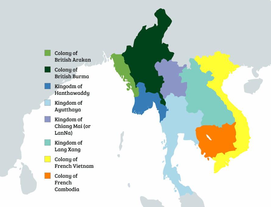 Hanthawaddy invece è sotto l’influenza francese che cerca di spingersi (di nuovo, dopo i falliti tentativi della fine del XVII secolo) verso Ayutthaya.