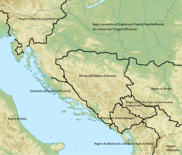 1914: questo fu un anno diplomaticamente decisivo, in quanto, in febbraio, venne stipulato l'accordo austro-italo-russo sui Balcani (cui poi vennero 'invitati' i rappresentanti di Romania, Bulgaria, Grecia, Montenegro e Serbia, ma più che altro per ratificare un fait accompli) nel quale si sanciva che le tre potenze per la universale pace, ritengono sommamente desiderabili gli attuali confini e si prodigano affinché rimangano stabili e sicuri.