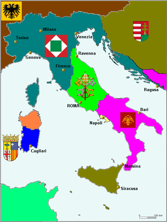 1205: L'Italia viene così suddivisa: Il sud rimane in mano ai bizantini, il centro al Papa e al nord viene creata la Lega Italica, una repubblica di stampo vagamente federale, che fa capo a Milano.