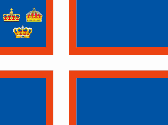 La bandiera dell’Unione di Kalmar introdotta da Cristoforo di Baviera: la croce rappresenta il vincolo tra le nazioni scandinave e le tre corone sono quelle di Norvegia (in alto a sinistra), Svezia (in alto a destra) e Danimarca (in basso).