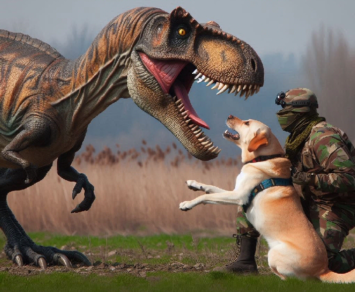 Una cosa è certa: se davvero i dinosauri fossero sopravvissuti fino ad oggi, un cane non esiterebbe a fare questo, pur di difendere il proprio padrone!!