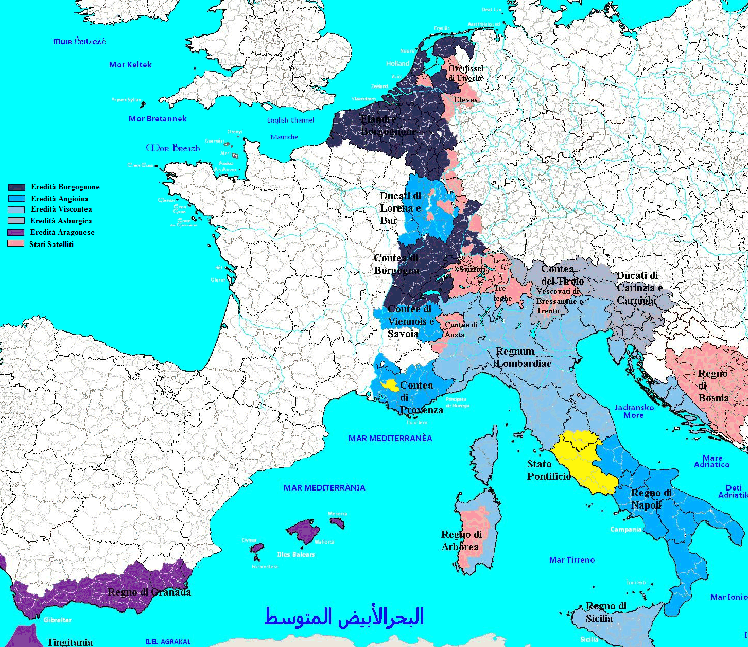 - Il duca di Borgogna inaugurò subito una serie di campagne per ampliare ulteriormente il suo potere, sia a nord, sia a sud. Il principato vescovile di Liegi aveva pagato cara l'alleanza con il re di Francia durante la guerra del bene pubblico, ed era stato praticamente ridotto in cenere. Solo la città stessa di Liegi rimaneva sotto il potere del vescovo. Che da quel momento in poi sarebbe stata una creatura del duca. Nel 1469 acquistò l'Alsazia asburgica dal duca del Tirolo, in grave carenza di liquidi. Successivamente, nel 1471-1472, acquistò da Arnoldo di Egmont il ducato di Gheldria. Ma le sue due campagne più importanti furono quella per la conquista della Frisia e quella contro gli svizzeri, in alleanza agli angioini. Sulla prima, c'è ben poco da dire. La Frisia venne annessa ai domini borgognoni già nel 1473. La seconda invece, creò grande scompiglio internazionale e fu indirettamente causa del cambiamento dei destini d'Europa. Gli svizzeri, che avevano guadagnato l'indipendenza dagli Asburgo, più o meno un secolo prima, nonostante avessero tra i migliori combattenti d'Europa, erano divisi tra loro e avevano vicini molto potenti: Lombardi, Angioini e Borgognoni. Tutti stati con cui, prima o dopo, si erano scontrati. La confederazione delle tre leghe, come si è visto, si era svicolata per tempo dall'alleanza con i confederati per legarsi ai lombardi, di cui sarà la fedelissima alleata. Il Vallese, non altrettanto perspicace, era stato conquistato, dagli stessi lombardi. Ora era il turno del corpo centrale della Federazione. Il casus belli fu un tentativo di espansione svizzera a nord-ovest, in direzione di Basilea. La città si sarebbe ben volentieri data ai confederati, ma era sotto la pesante tutela ducale, che ogni giorno si faceva più pesante. Il duca minacciò quindi la confederazione di non tentare alcuna mossa ostile nei confronti dei suoi protetti, o l'avrebbe pagata cara. Per tutta risposta i confederati fecero due mosse: la prima fu di cercare l'aiuto dei lombardi, perlomeno come mediatori; la seconda, sollevare una lega anti-borgognone. Essa superò le più rosee aspettative degli svizzeri: Strasburgo, Ehnehim, Schlettstadt, Hagenau, Zabern, Weissenburg si unirono alla confederazione. L'entusiasmo era alle stelle. L'elettore palatino era tentennante, ma anch'egli era fortemente tentato di entrare nella partita, così come l'arcivescovo di Treviri. I vescovati di Metz e Verdun aderirono entusiasti: era la loro opportunità per lanciare un chiaro segnale agli angioini, che per il momento erano rimasti sulla finestra. Toul invece non si fidava di una facile vittoria e rimase neutrale. Ma la sorpresa fu l'unione alla confederazione dei Sabaudi, che la vedevano come l'occasione per recuperare margine di autonomia sul potente vicino, visto anche che i lombardi non si sarebbero alleati al duca. Anzi, semmai avrebbero ostacolato i suoi piani. Il problema era per gli angioini. Essi erano grandi alleati sia di Carlo, sia di Can Galeazzo e non sapevano bene che pesci prendere. Una cosa, però, Can Galeazzo si era fatto promettere dagli svizzeri, che non avrebbero chiesto l'aiuto del re di Francia.